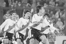 Ese penal fue orgásmico. Tuvo todos los condimentos. Trotta puteado por toda la gente de Velez y pelado a muerte con Chilavert, había hecho un gol en contra. Despues vino el penal: primero le rompió el arco y el arbitro cobró invasión de zona. Y despues se la picó con mucha clase y lo gritó con alma y vida. Partidazo que terminó 3-2 para River y pidiendo la hora. Falcioni era DT de Velez.