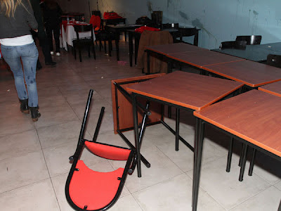 Promediando la reunión, a la que asistieron 50 vecinos, apareció la barra y realizó un fuerte escrache. Lanzaron huevos, vinagre y pintura al grito de “Macri regalaste el club”, “El que no salta es un traidor” y “Comu no se vende”. El Jefe de Gabinete, rápidamente, advirtió la movida y se escondió en las instalaciones del salón de eventos Ruta 40, ubicado en la Avenida Nazca 2325. Varias personas intentaron frenar el reclamo, los cuales fueron repelidas a golpes de puños. Luego del incidente, el meeting continúo. Más tarde, la Policía Federal confirmó que había una persona detenida por estos hechos.