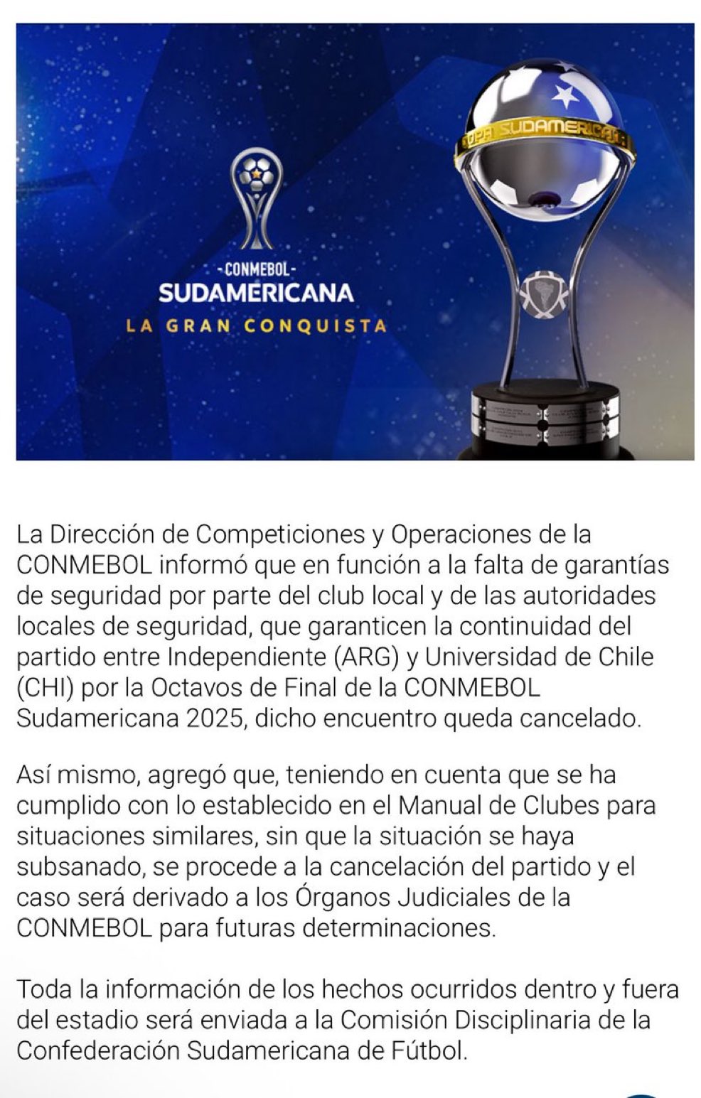Grindetti: “Me estoy yendo a Paraguay a hablar con Conmebol, esto solo merece sanción para el club Chileno y que se quite toda responsabilidad a Independiente”