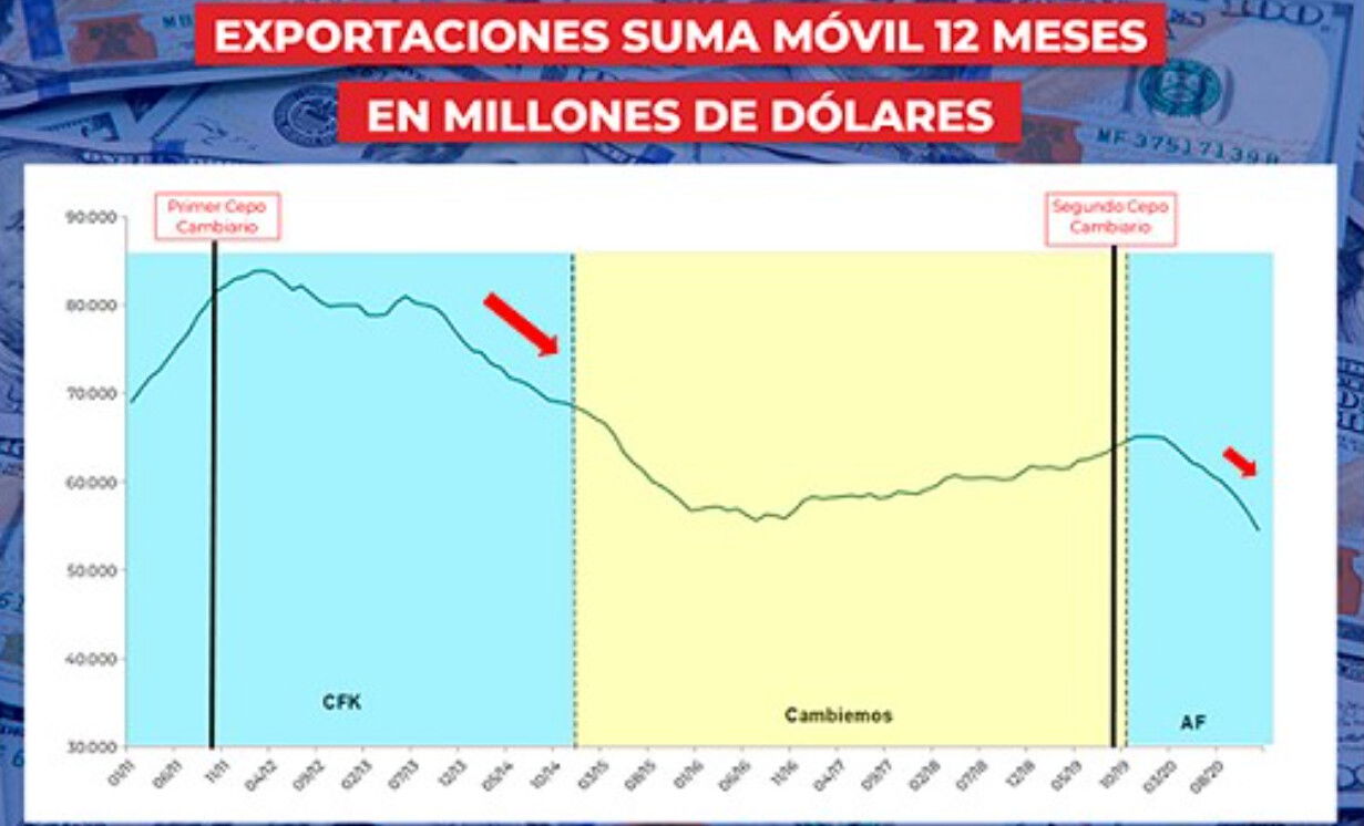 No estoy de acuerdo con las retenciones a la economía del conocimiento, de hecho creo que puse la nota en el foro festejando la medida de este gobierno cuando las sacó. Sin embargo las exportaciones en general aumentaron de forma constante con Macri (justamente porque no había cepo).
