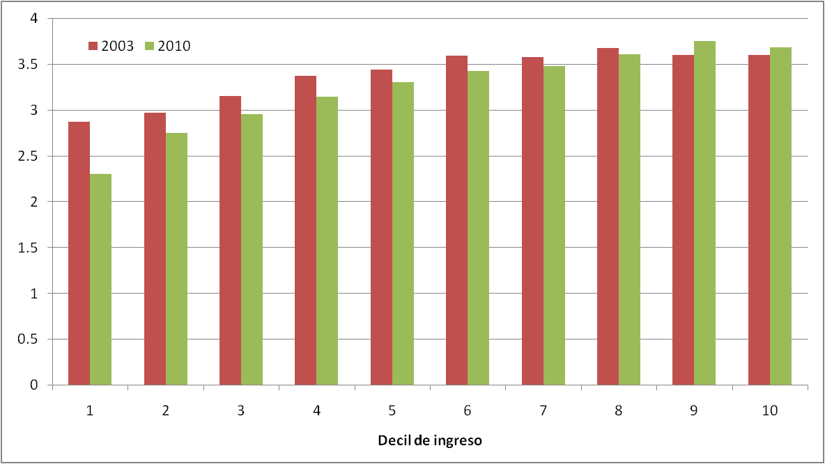 Pero una mirada al tamaño de hogar promedio no justifica la caída del cociente. De hecho, los hogares de ingresos por encima de la media no modificaron sustancialmente su tamaño promedio: