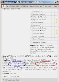 ¿En qué quedamos? En la edición “papel” de Clarín Deportivo, dice una cosa; en la edición electrónica, otra. Aparte, el pobre Mouche no pudo hacer su debut en el Gran DT, todo por ingresar un minuto antes o un minuto después, da igual (ver la entrada “Todos los puntos de la 11va. fecha” en este blog) ¿Hay alguna reyerta entre los Jueces del Areópago? ¿Son los amigos de Basile versus los amigos de Bilardo? ¿Hay cabaret en Clarín?