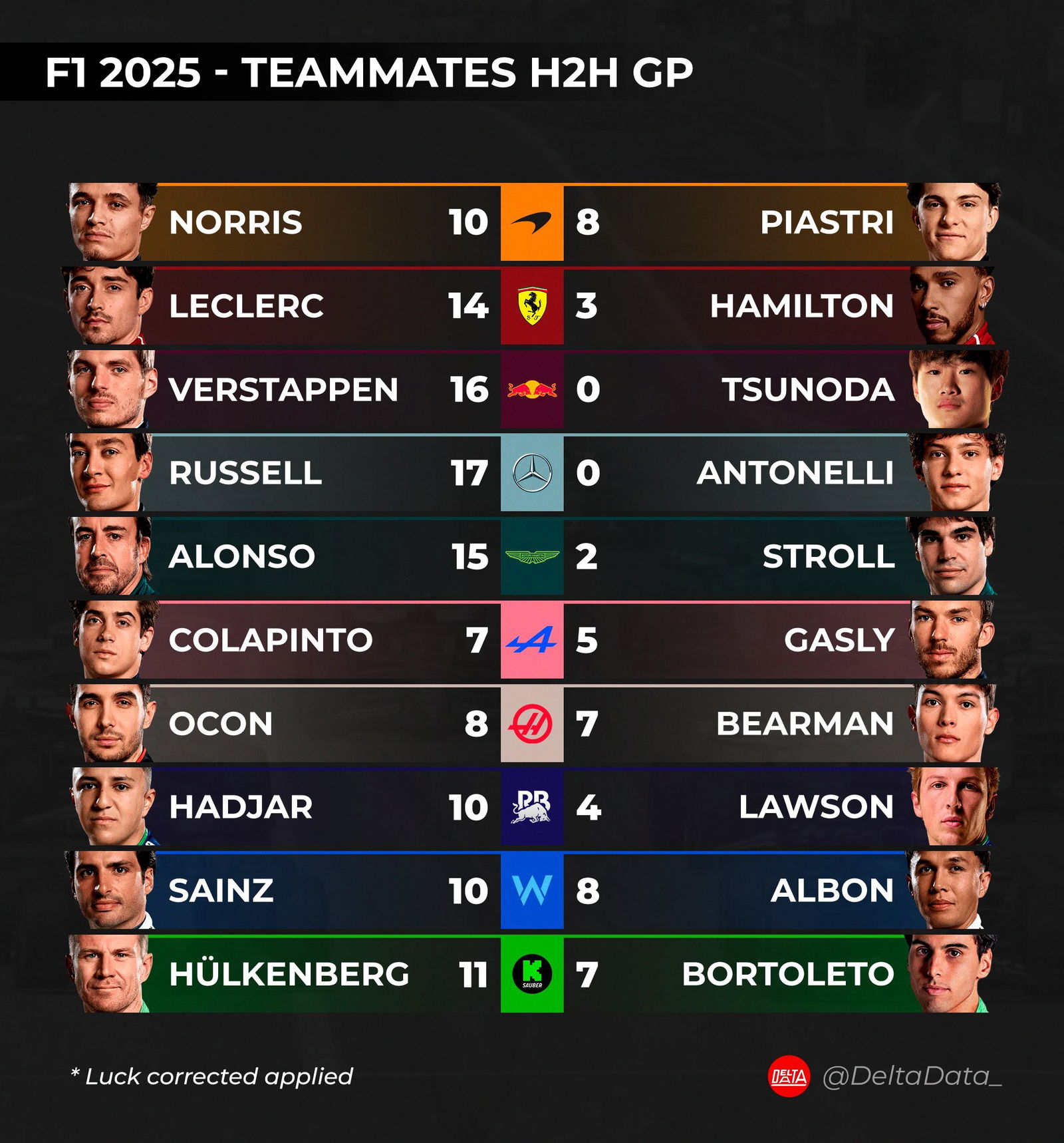 Es el unico rookie de este año que le gana al mas experimentado en esa lista, Hadjar y Lawson no cuentan porque ambos son rookies.
