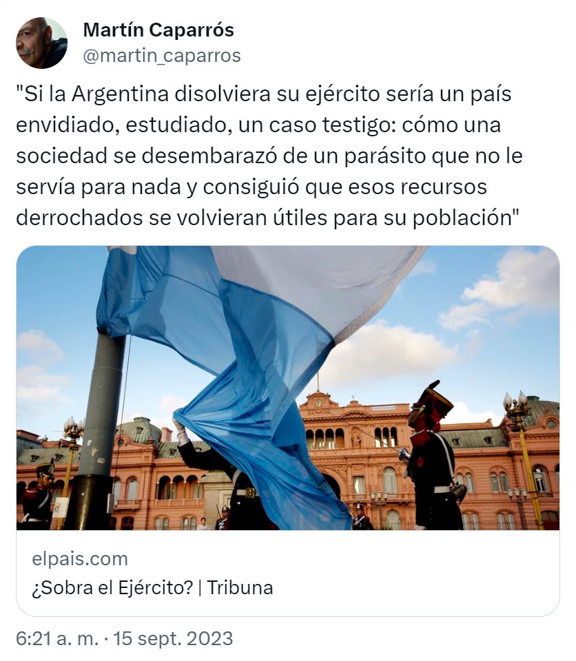 El resto de los países del mundo, tienen fuerzas armadas, incluso los países con los cuales este señor comulgo y ahora comulga sus ideas, sea antes cuba castrista, o ahora España…porque no les pide a ambos que eliminen ellos eso y dediquen ese dinero para la educación, salud, etc, sobre todo Cuba??? Seguro lo mandan a la mierda sin sonrojarse y lo tildan de salame o loco…