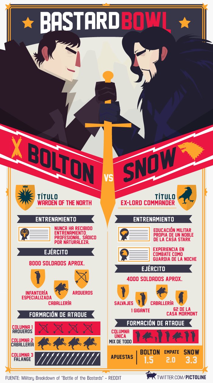 Vengo a desentonar y decir que me parecio predecible. Que iba a aparecer Meñique era tan obvio… lo mismo lo de Rickon, escondete atras de las cruces pelotudazo. Y jon lo ve muerto desde el caballo y ni siquiera se baja a verlo :lol: nefasto. Despues la batalla estuvo a la altura de cine pero nada que no se haya visto antes, muy comun. Me gusto mas Blackwater. Lo que promete es lo de Davos con la bruja roja, Davos remember. La muerte de Ramsey fue muy buena, aunque me hubiera gustado que mostraran mas.