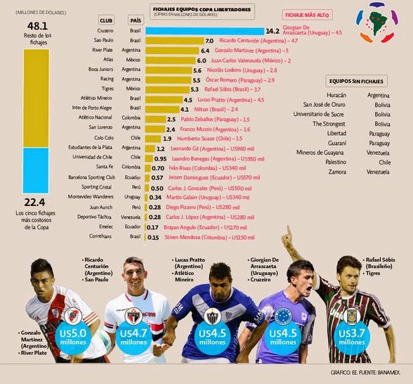 En total, los 32 equipos participantes de la edición 2015 de la Copa Libertadores invirtieron 70.500.000 dólares en contrataciones pero sólo 13 superaron el millón.