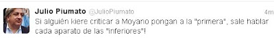 El secretario general de Judiciales, Julio Piumato sabe que puede generar titulares de la prensa opositora a través de su cuenta de Twitter. Lo logró la semana pasada con aquel que mandó que la semana pasada amenazando al Gobierno con que Hugo Moyano puede llegar “a hablar” si le sueltan la mano en las causas judiciales que lo complican luego de la respuesta del juez federal Oyarbide a un exhorto de la justicia suiza respecto de una causa por lavado de dinero que involucra a la empresa Covelia relacionada con el lider camionero.