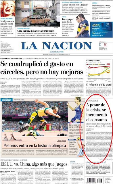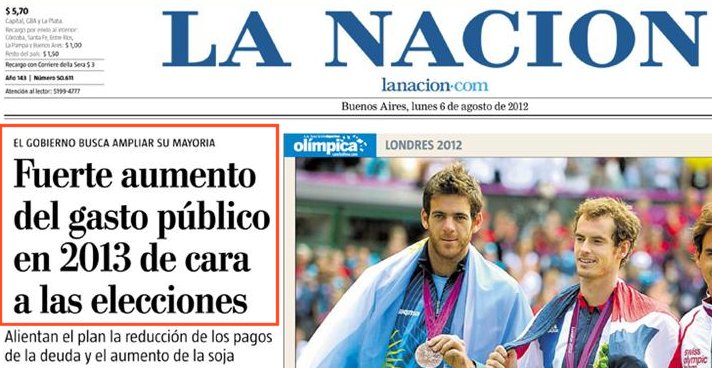 Vemos en la primera plana de La Nación el titular que corresponde a esta notade Mariano Obarrio en donde advierte que el Gobierno luego del pago del Boden 2012 pone la proa hacia el objetivo de ganar las elecciones legislativas del año que viene con una serie de medidas que significan un fuerte incremento del gasto público financiado por el aumento de la recaudación debido a los buenos precios internacionales de la soja y el alivio en las cuentas externas debido a que los pagos de deuda que corresponden al año quie viene son significativamente menores a los de este duro 2012:
