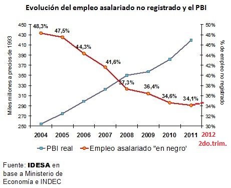 Los indicadores del segundo trimestre del año 2012, muestran que el 34,5 % de la población activa no esta registrada; y la situación se mantuvo estable en comparación al mismo lapso de 2011
