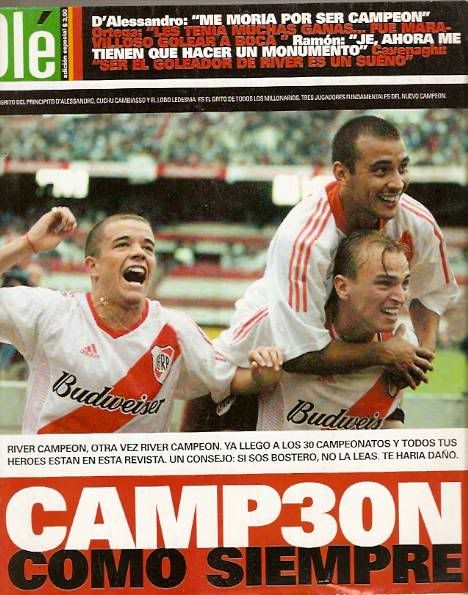 - Después del fracaso de River en 2001, Ramón Díaz vuelve a salir campeón con el club de sus amores. El plantel contaba con la experiencia de Ortega y con figuras juveniles como Andrés D’Alessandro y Fernando Cavenaghi, es por eso que a River no se le hizo difícil pelear el campeonato. River mostró buen fútbol como en el 6 a 0 a Unión, la victoria 3 a 0 ante Boca en La Bombonera y el increíble final del cotejo contra Racing, golazo de “Pipino” Cuevas incluido. River se consagró nuevamente campeón y Ramón Díaz consiguió su séptimo título como técnico de River. El millonario ganó el campeonato con seis puntos de ventaja sobre Gimnasia de La Plata (Subcampeón), y fue la mejor defensa (13 goles en contra) y el mejor ataque (39 tantos a favor). Sin embargo el presidente José María Aguilar declaró que “En River ha llegado la hora de conocer otros rumbos”, y Ramón Díaz deja su cargo al finalizar ese año.