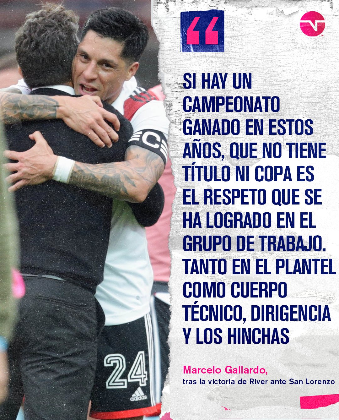 Gallardo es para mí el MAXIMO IDOLO DE LA HISTORIA DE RIVER. Nadie nos dio tanto como él, es el más grande. Tratarlo de traidor por un partido en el que puso a un equipo totalmente “psycho”, como todos decían más arriba: “Pochettino - Palavecino - Paradela - Barco - Beltrán y Borja”, que manda a Herrera en el último minuto a empujar burdamente a uno de Racing, y que los boludos de Racing no pueden terminar de hacer un gol, con todas las facilidades que les dimos, y resulta que es culpa de Gallardo. Que cuando termina y le preguntan, dice: “salimos a ganar e hicimos lo que creíamos que había que hacer”. ¿Qué querían que diga? ¿Y en su último partido??? ¿Que queríamos perder pero por boludos no perdimos?? Tengo un primo hincha de Racing que estaba en la cancha y veían en el penal que Armani le señalaba al boludo a qué palo tenía que patearle. ¿Y liquidamos durante tantos meses a los ídolos máximos del club??
