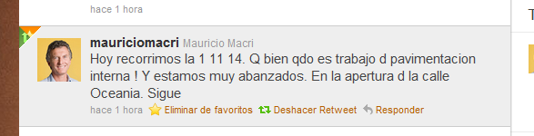 Nooo, no tengo twitter. Se lo choreé del blog al verdugo de Leuco, Lucas Carrasco. Igual si tuviera twitter los seguiría de cerca a los dinosaurios estos del Pro, posta que son muy boludos…