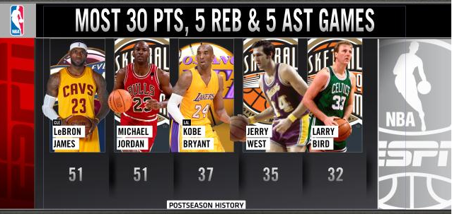 LeBron con 38 puntos (14/24 TC), 12 rebotes, 6 asistencias, 3 tapones, 3 robos y 0 perdidas