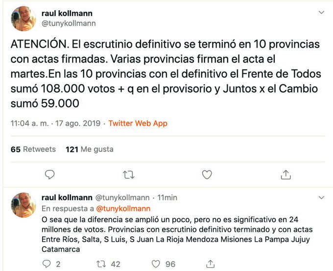 Para que veas de la magnitud que debería ser el fraude. Si se hubiera choreado 1 millón de votos el Frente Todos y fueran para Macri la elección hubiera salido 45 a 37. Con 1 millón de votos sigue siendo paliza! Para un fraude de tal magnitud hubieran necesitado infiltrar todo el centro de datos, sobornar a la Justicia Electoral, engañar a no menos de 5000 fiscales de cambiemos y que Marcos Peña tenga la de La Cámpora abajo de la camisa. Solo alguien fuera de sus cabales o que recurre al TAS si pierde, puede suponer que hubo fraude de la oposición.