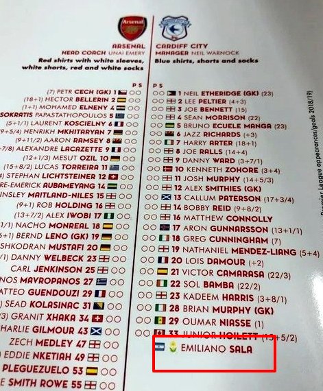 Programa oficial de Arsenal - Cardiff City. Arsenal decidió poner a Emiliano como parte del Cardiff y reemplazar su número por una flor amarilla, la elegida por el club galés y Nantes para pedir por nuestro compatriota.