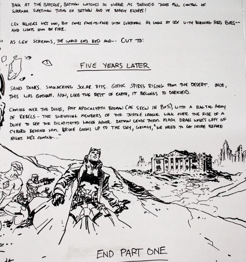 Dunas de arena. Pozos solares humeantes… Esto alguna vez fue Gotham. Ahora, como el resto de la Tierra, pertenece a Darkseid. Sobre la duna, Batman post-apocalíptico con un ejército improvisado de rebeldes —los miembros sobrevivientes de la Justice League— caminan sobre la cresta de una duna para ver la deteriorada Mansión Wayne. Batman los lidera. Flash arrastra lo que queda de Cyborg detrás de él. Bruce mira al cielo, sombrío: “Tenemos que entrar antes de que llegue la noche. Ya viene”.