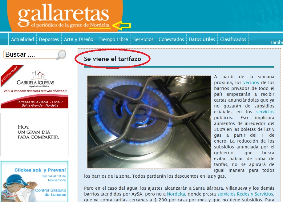 Esta vez, nuestros amigos (?) de Gallaretas advierten a sus lectores, que no son otros que los habitantes de la Ciudad Pueblo (?) y sus alrededores, que se viene un “tarifazo” que puede rondar las suculentas (?) sumas de $15o en el caso de la electricidad, $100 para el gas, y $50 en el caso del agua corriente (este último servicio para los propietarios de los countries vecinos, porque en Nordelta desde hace rato que se dejan meter la mano en el bolsillo con una empresa que es amiga del Masterplan).