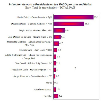 Ya definida una única formula del FpV, Daniel Scioli encabeza la intención de voto para las PASO presidenciales superando el 35%.