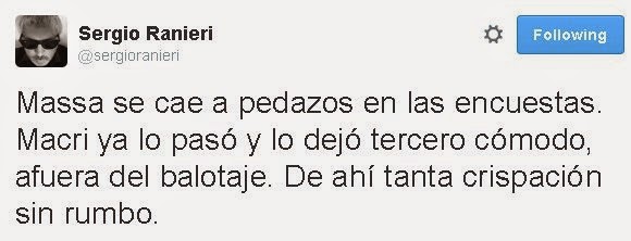 Mi amigo Sergio Ranieri larga este tweet luego de ver una encuesta de esas que no se publican hecha por una consultora que suele trabajar para el mismísimo Sergio Massa. Parece que en la lucha de entrar al balotaje con el FpV lo viene aventajando Mauricio Macri que sin territorio pero con conocimiento e identificación absolutamente diferenciada del kirchnerismo lo desbancaría al tigrense.