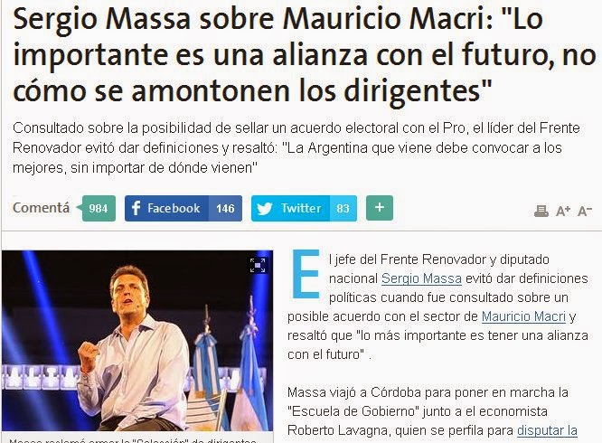 Ayer en su columna política, Alfredo Silletta dijo que se empezaban a motorizar negociaciones para tratar de que ambos dirigentes converjan en un mismo frente. Consultado Sergio Massa al respecto en su visita a Córdoba, si bien no admitió que esto exista tampoco negó de plano la posiblidad de que se de. Leemos aca en La Nación: